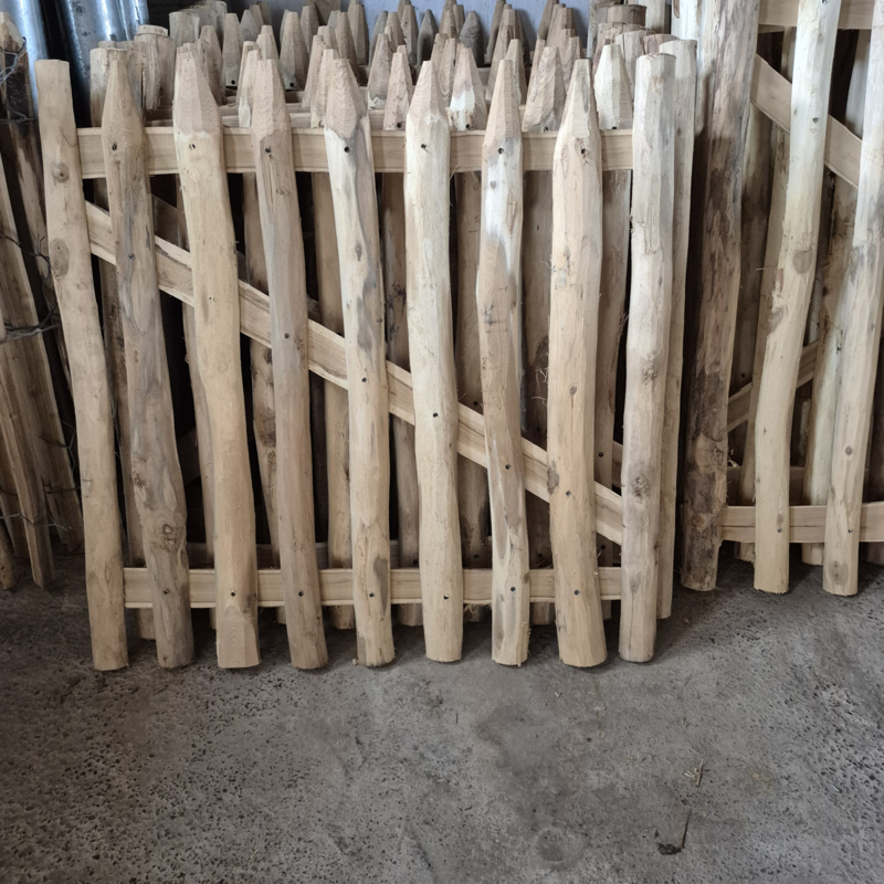 Dit model is ontworpen met een latafstand van 4 tot 5 cm. Dit zorgt voor een strakke, maar toch landelijke look die perfect aansluit bij schapengaas of kastanje afsluitingen. De latten zijn zorgvuldig geselecteerd op hun natuurlijke vorm, wat elk poortje een uniek en authentiek karakter geeft.
